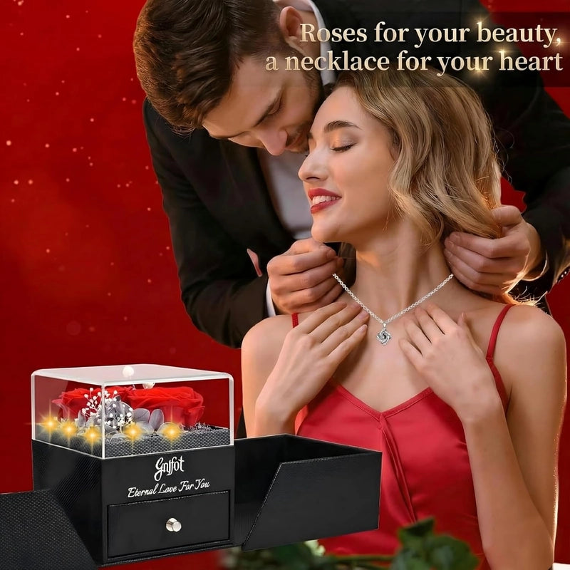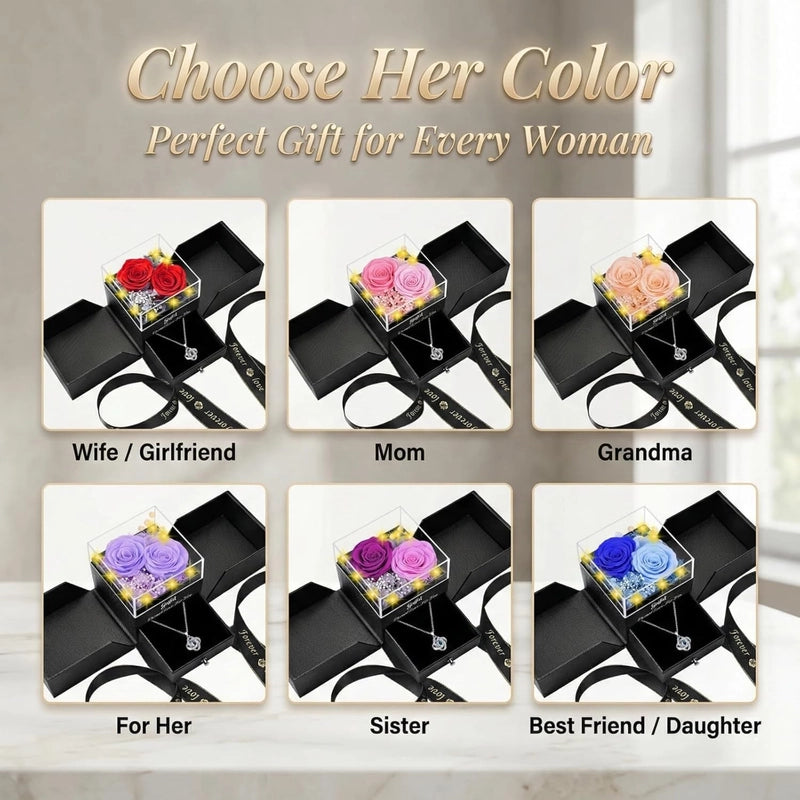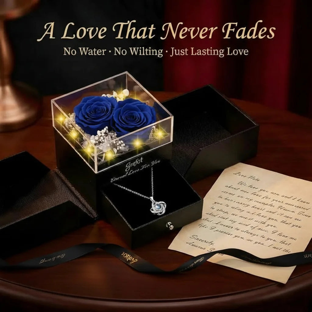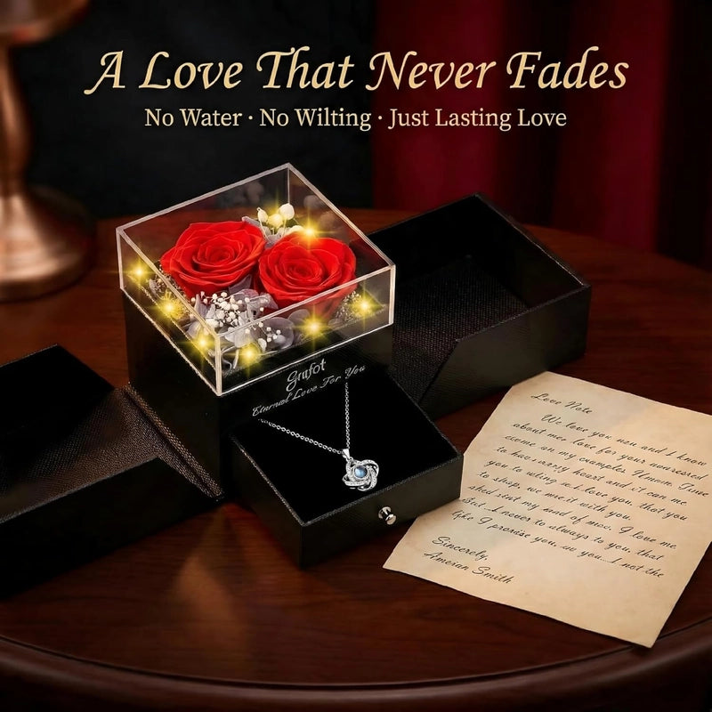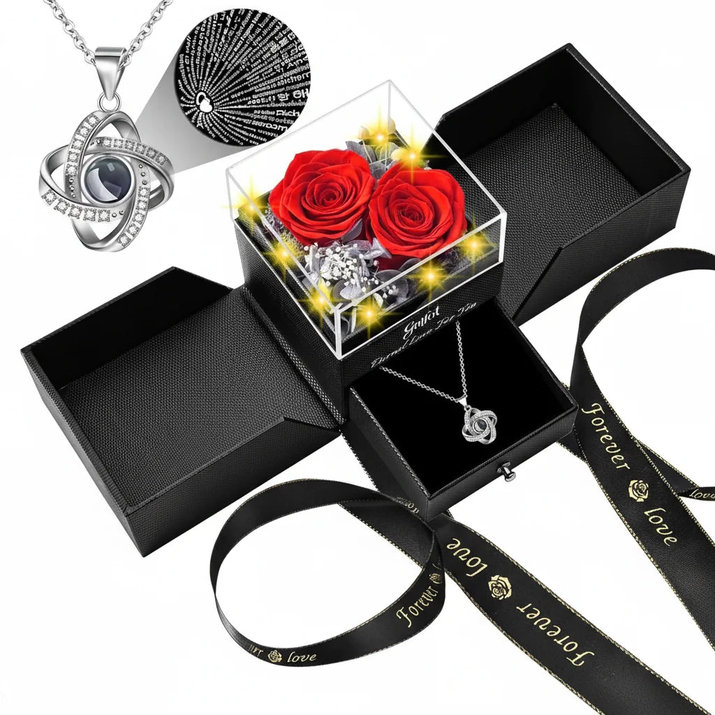 A tender declaration, where two everlasting roses whisper tales of devotion, paired with a luminous necklace that unveils your love in 100 whispered languages.