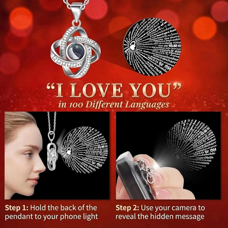 Within this delicate pendant rests a secret, luminous language, ready to unveil 'I Love You' in 100 ways, a bespoke testament to your deepest sentiment.